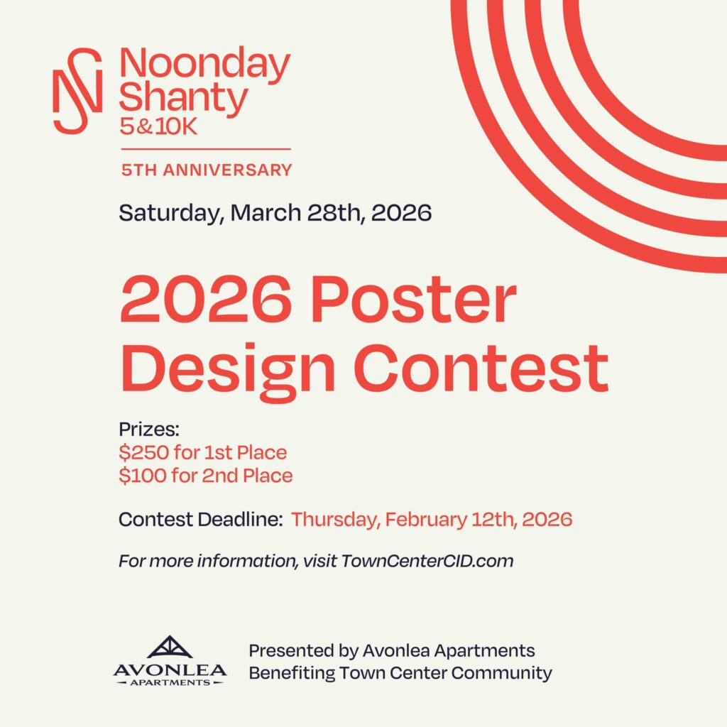 The Town Center Alliance, the 501(c)(3) nonprofit partner of the Town Center CID, is sponsoring a commemorative poster design contest for its upcoming Noonday Shanty 5K & 10K. Cash prizes will be awarded for the first and second-place designs. The first-place design will be the official commemorative poster for this year’s Noonday Shanty. It will be given away at packet pick-up and will be featured in various promotional materials for the race by the Town Center Community Alliance.