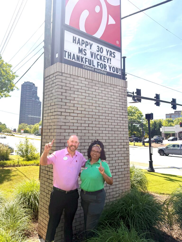 McCabe adds, “Come by Chick-fil-A at Akers Mill to see our morningTeam Leader, Vickey, and give her a big congratulations for doing this job in our community for 30 years!”
