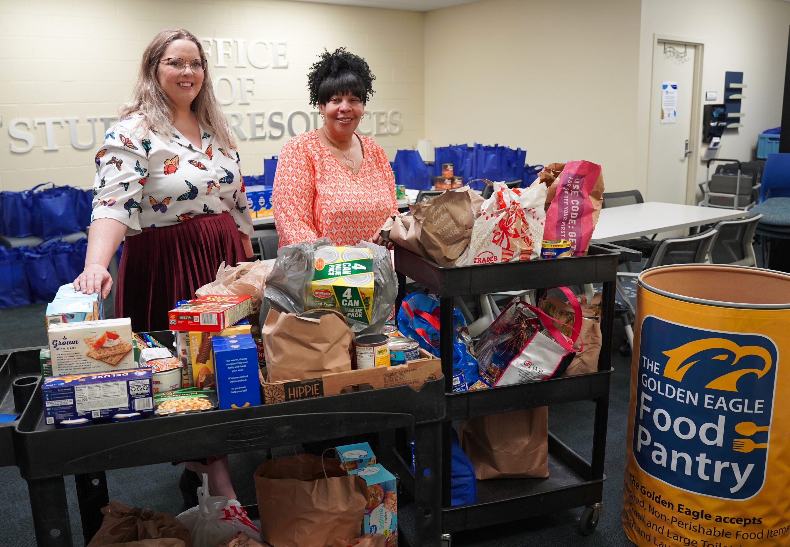 On Thursday, Nov. 16, the Golden Eagle Food Pantry distributed “Everything but the Turkey” Thanksgiving food packages, which included items ranging from canned corn, green beans and cranberry sauce to boxes of potatoes, stuffing and gravy packets. The food pantry’s mission is to directly serve college students who suffer from hunger and food insecurity, which is a lack of consistent access to enough food. An estimated one in three students experience food insecurity on college campuses across the country, according to the National Center on Safe Supportive Learning Environments (NCSSLE). Food insecurity may impact not only college student health but also their ability to perform well academically and stay in school.