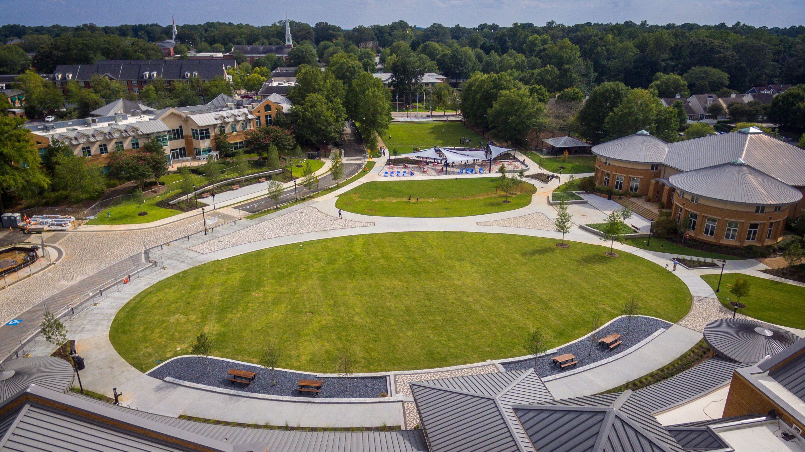 Improvements to Smyrna’s downtown area include a new open greenspace with wide sidewalks, plazas, shade structures, and an interactive water feature, as well as updated site furnishings, lighting, and landscaping. The project also included upgrades to the associated utilities and stormwater infrastructure, as well as the demolition and reconfiguration of a roundabout into a more pedestrian-friendly shared street and greenspace.