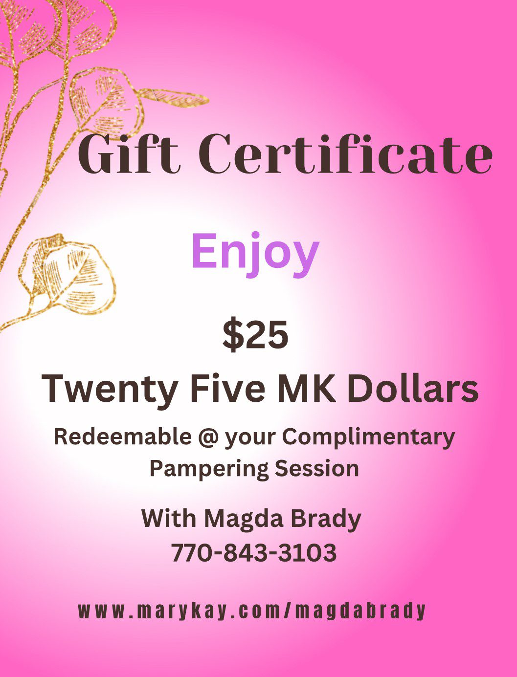 - $25 MK Gift Certificate to redeem @ your complimentary Mary Kay pampering session of your choice.