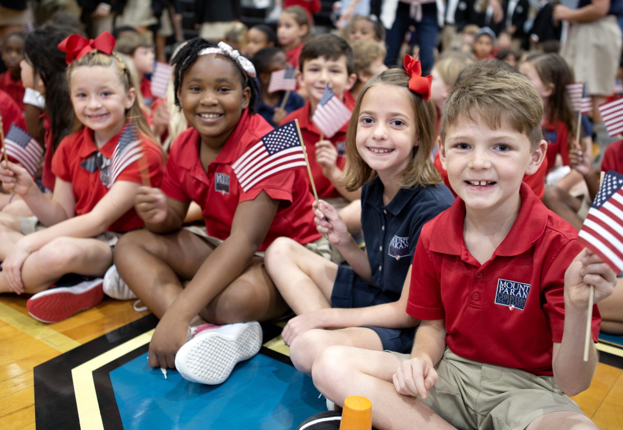 Students donned red, white, and blue attire, with the youngest seated on the floor, waving tiny American flags. An oversized American flag provided a patriotic backdrop to the festivities, with palpable excitement in the air for the only schoolwide chapel ceremony of the year.