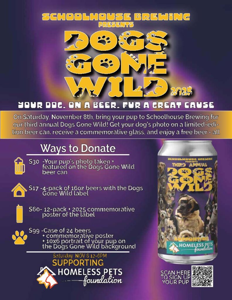 Schoolhouse Brewing is once again inviting beer lovers and dog owners to grab a leash and a pint glass for its third annual Dogs Gone Wild event on Saturday, November 8, 2025, from 12 to 6 p.m. at the brewery’s Marietta taproom. The event raises funds for the Homeless Pets Foundation, helping local rescue dogs find their forever homes.